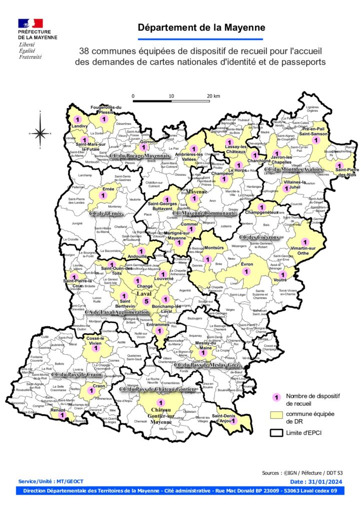 Depuis le 1er mars 2017, les demandes de carte nationale d’identité (CNI) doivent être déposées auprès des communes équipées d’un dispositif de prise d’empreintes digitales. Les plus proche de Sacé sont les mairies de Martigné, Andouillé, Commer, Louverné. Voici la carte complète des mairies équipées en Mayenne :